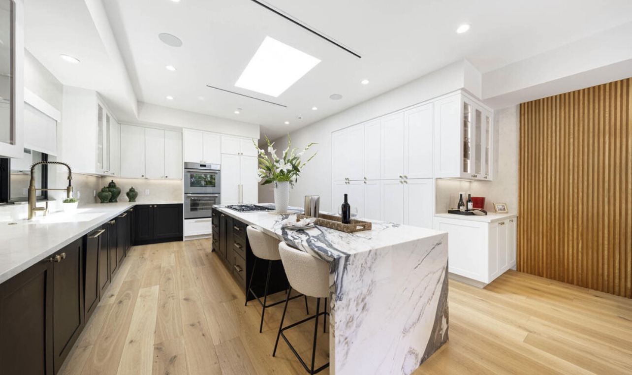 The chef’s kitchen centers around a stunning 12-foot marble waterfall island, custom cabinetry, and high-end appliances, flowing seamlessly into the family room with built-ins, wine rack, LED-lit display shelves, and accent wall design. La Cantina doors open to a resort-style backyard with pool, spa, elevated deck, and grassy lounge area. The serene primary suite features dual LED-lit walk-in closets, a spa-inspired two-person shower, dual vanities, and sliding doors to a private outdoor retreat.